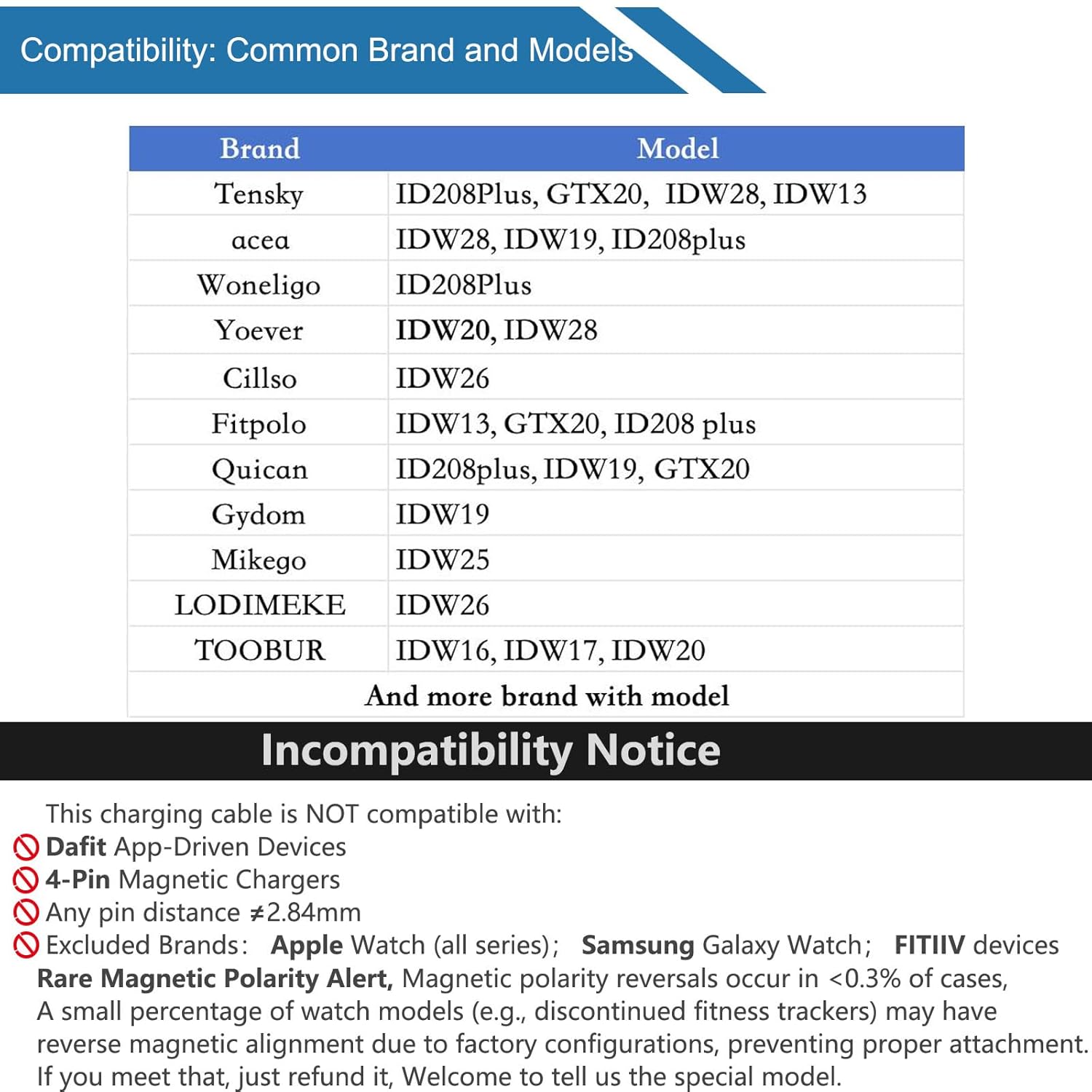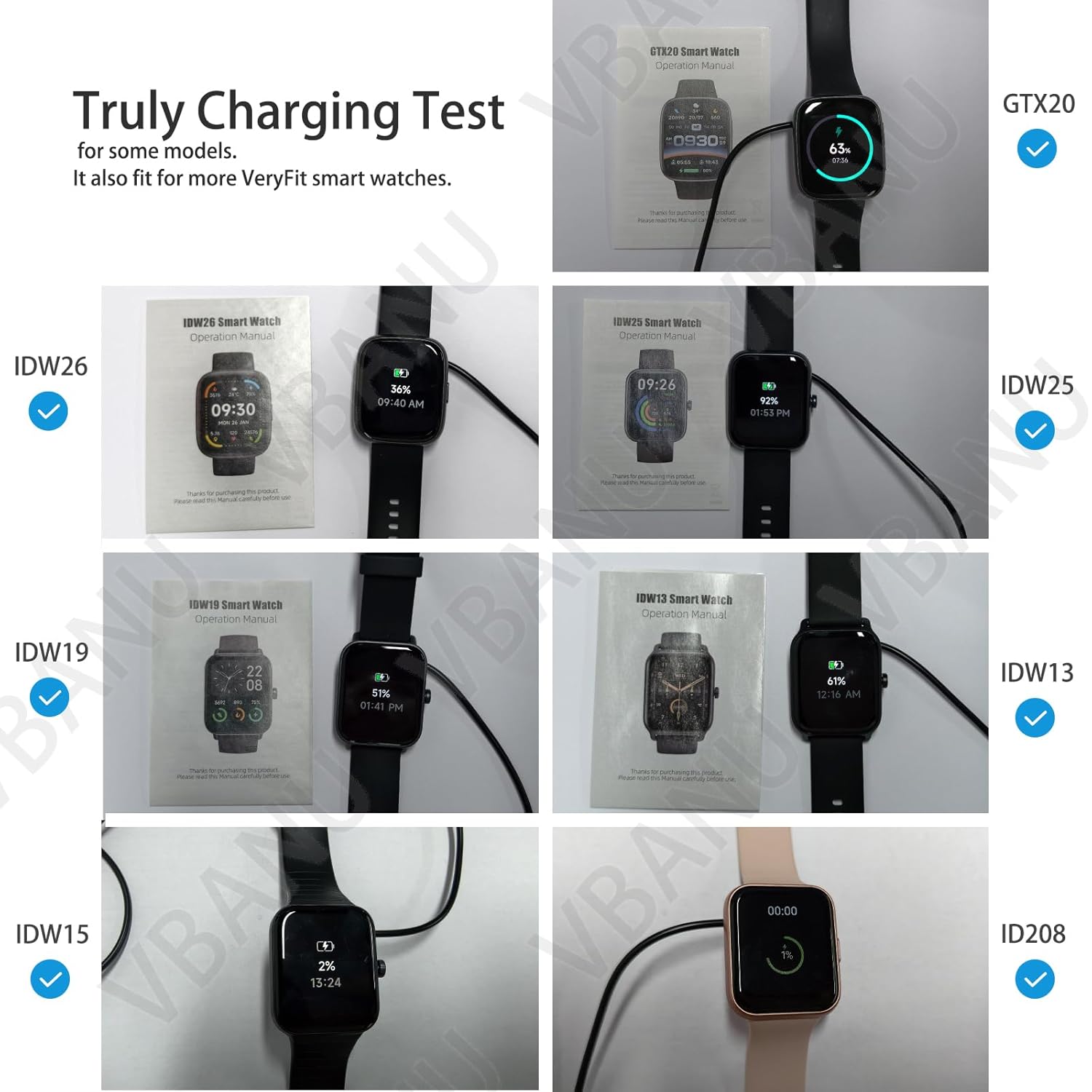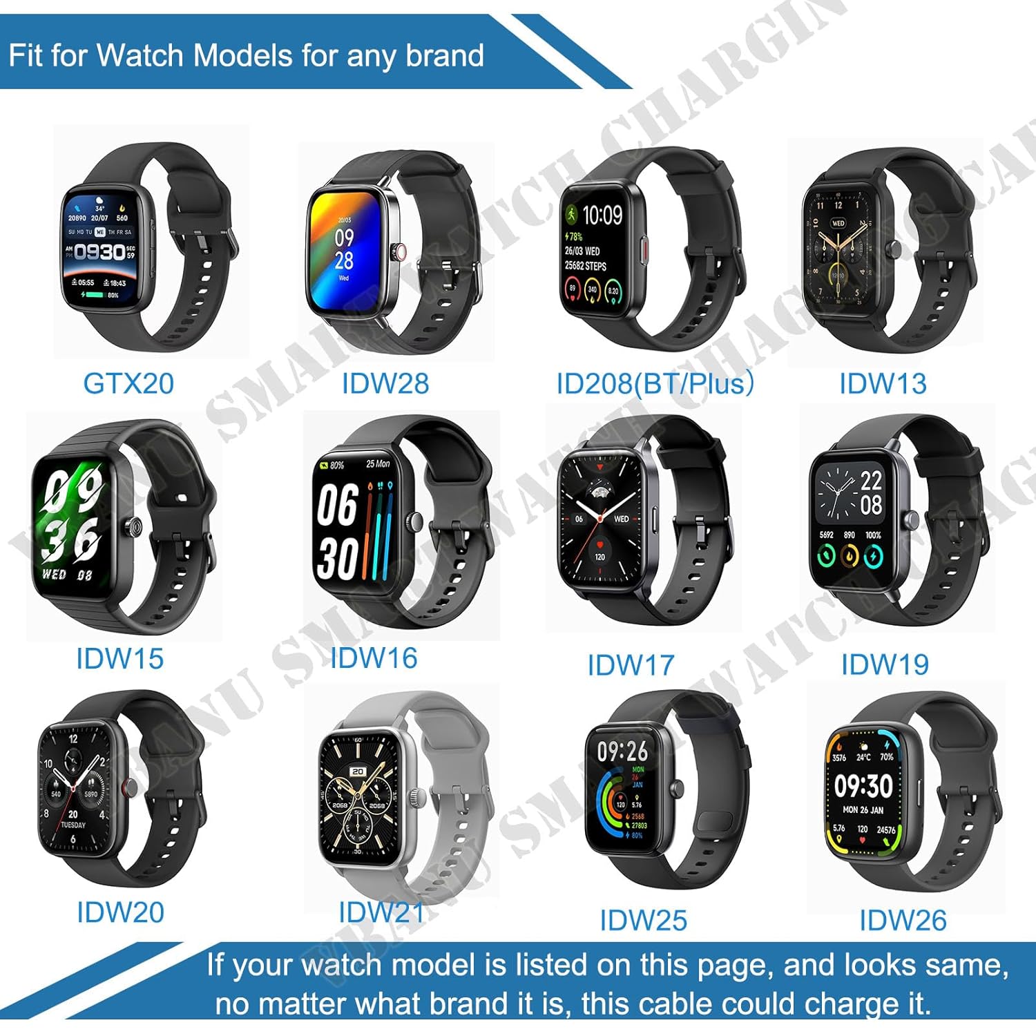 【Fit for】This smart watch charging cable could be used for the models like ID208(BT/Plus), GTX20, IDW28, IDW26, IDW25, IDW23, IDW21, IDW19, IDW17, IDW16, IDW15, IDW13, and more models using VeryFit app. Also fit for some smart watch brand like TOOBUR, Tensky, acea, Woneligo, Yoever, Cillso, Fitpolo, Quican, Gydom and more. Check the Product Description below for more details.