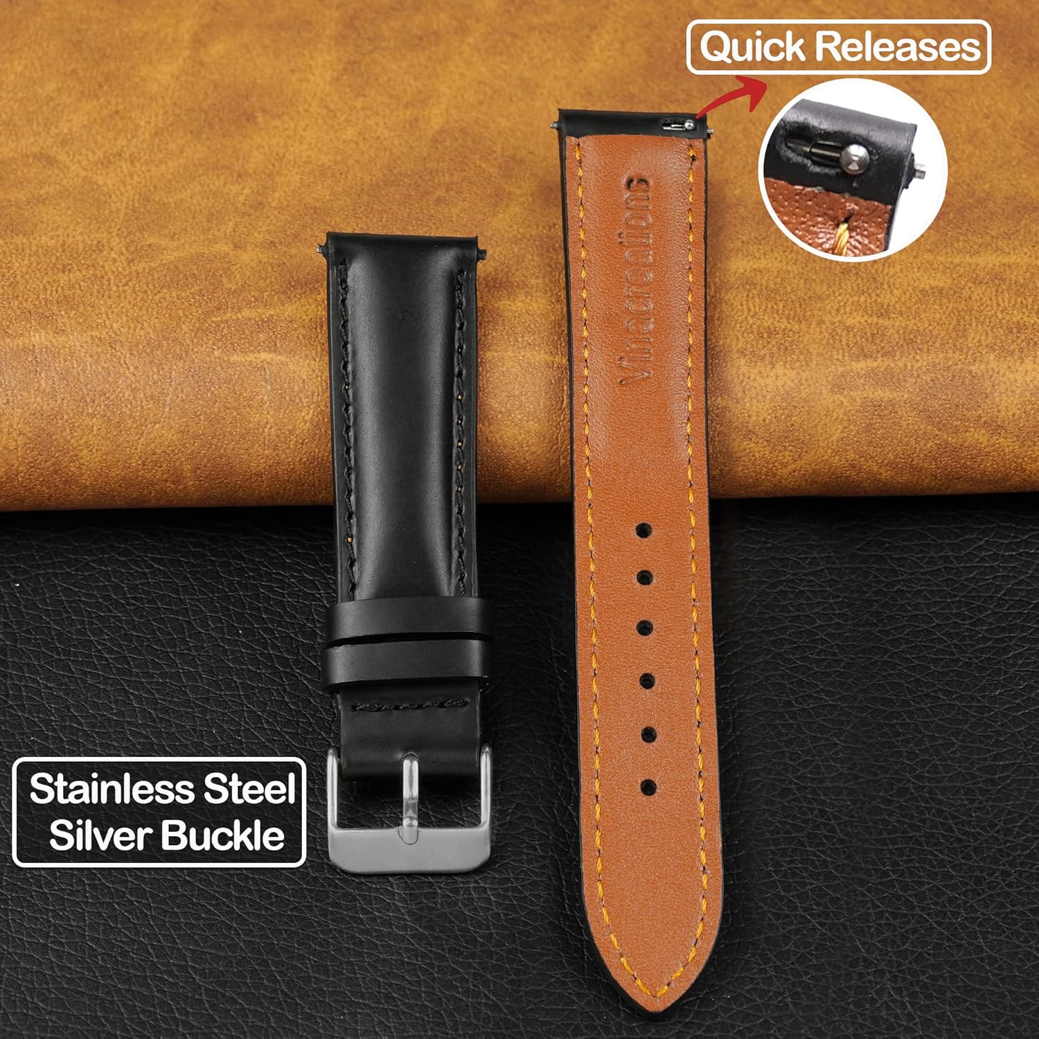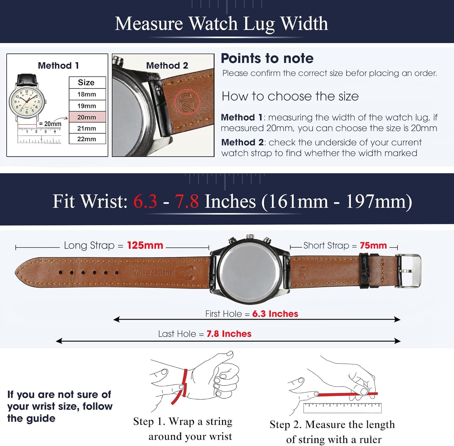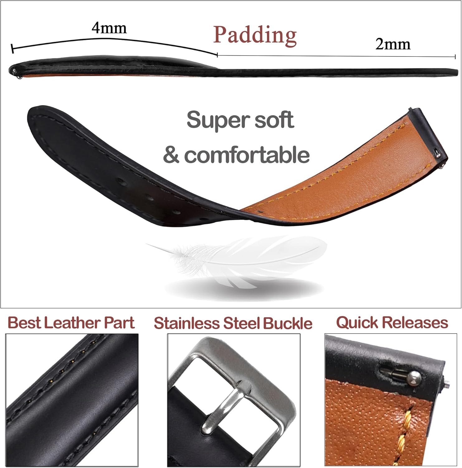 18mm Leather Watch Straps are Compatible with LG Watch Style, Withings Activite, Huawei Watch 1st Gen, ASUS Zenwatch 2 1.45″ (small version), Withings Steel HR 36mm, Withings Sapphire, Venture, Scarlette, LG Watch Style. Also suitable for other watches with 18mm lug width.19mm Leather Watch Straps are Compatible with Citizen Eco-Drive AW1360, Seiko Presage SRPB Series, Bulova Classic, Movado Heritage Series, Hamilton Khaki Field Automatic. Also suitable for other watches with 19mm lug width.20mm Leather Watch Straps are Compatible with Ticwatch 2, Samsung Gear S2 Classic (SM-R732/R735), Fossil Q Gazer, Samsung Gear Sport (not fit Samsung Gear S2), Samsung Galaxy Watch (42mm), Samsung Galaxy Watch Active (40mm), Nokia Withings Steel HR 40mm, Pebble Time Round Large. Also suitable for other watches with 20mm lug width.21mm Leather Watch Straps are Compatible with Omega De Ville Prestige, IWC Portugieser Chronograph, Maurice Lacroix Pontos, Citizen Signature Collection (select models), Movado Museum Classic (select models). Also suitable for other watches with 21mm lug width.22mm Leather Watch Straps are Compatible with Seiko SKX007, Pebble Time, Pebble Time Steel, Pebble Classic, Huawei Watch 2 Classic, Samsung Gear S3 Frontier and Classic, LG G Watch W100, LG G Watch R W110, LG Watch Urbane W150, Zenwatch (1st Generation), Fossil Q (1st Gen), Fossil Q Founder 2.0, Fossil Grant, Fossil Wander, Fossil Crewmaster Hybrid. Also suitable for other watches with 22mm lug width.