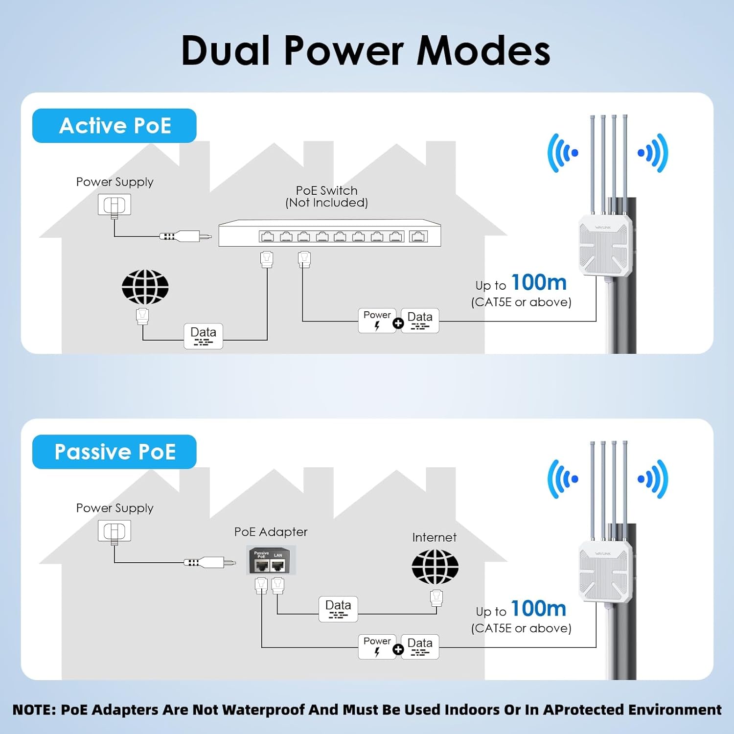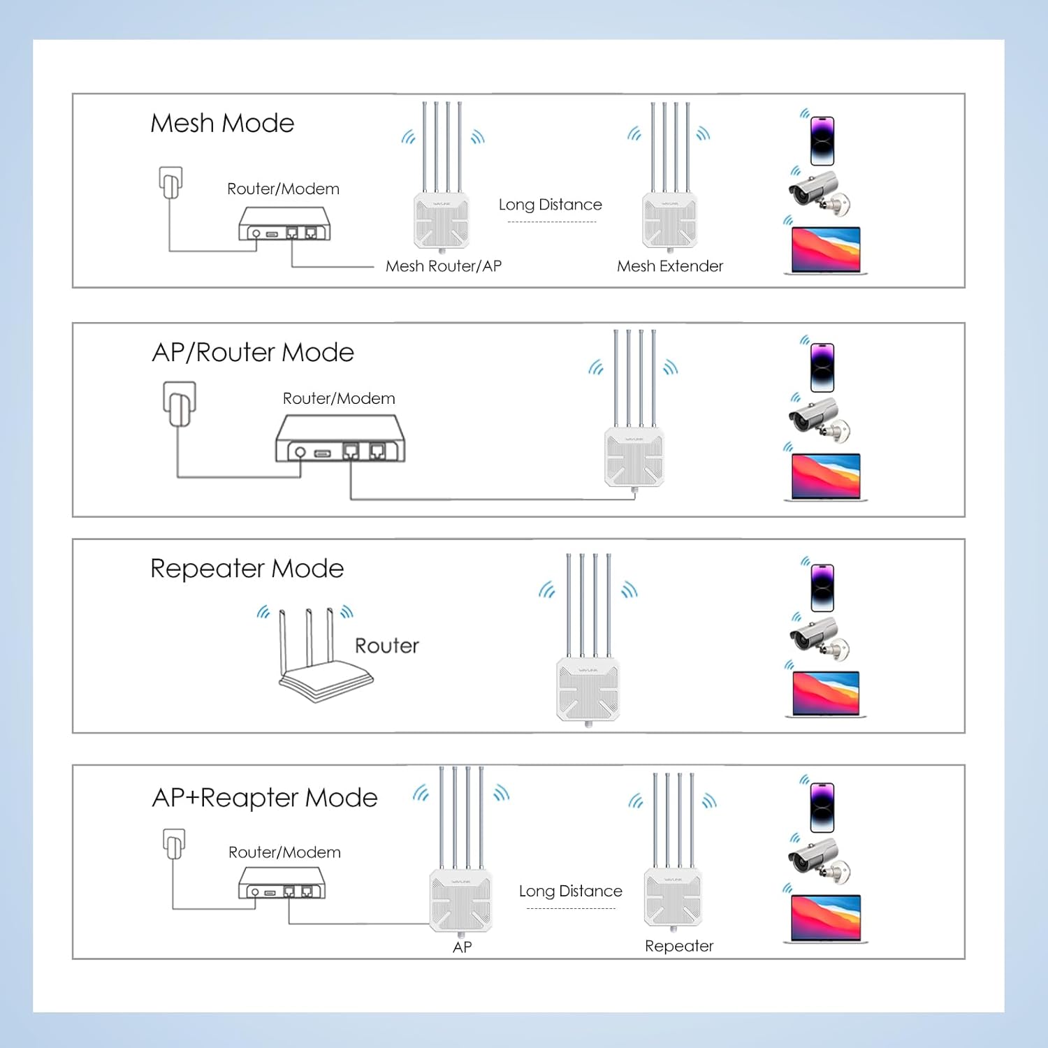 【Multiple Modes, Flexible Use】Equipped with IP67 waterproof enclosure, 15kV ESD protection and 6kV lightning protection, it can work normally in rain/snow/wind/thunder and other bad weather. Supports Mesh, AP, Router, Repeater, AP/Repeater and other modes to meet your different needs and apply to more outdoor use scenarios